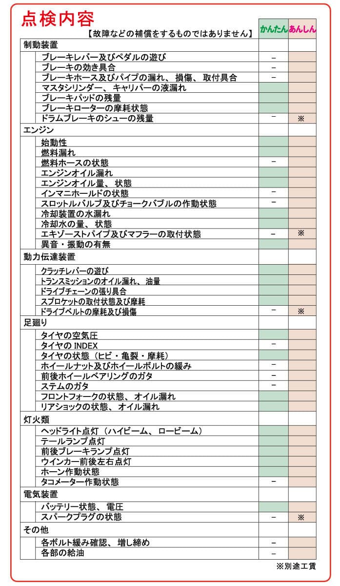 日頃からバイクに乗られている方、たまにバイクに乗る方とバイカーによってバイクに乗る頻度は様々です。また、排気量によっては車検がない為、普段の整備だけでは不安が残るというお話もよく聞く事があります。