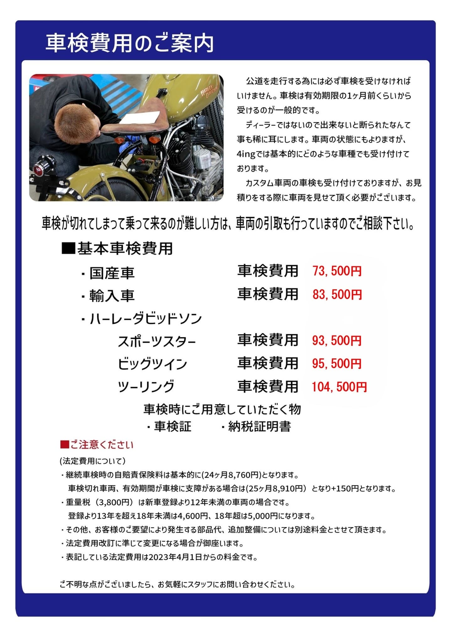 認証工場である4ing Custom Pro Shopでは車検の際の基本料金を次の表のように設定しております。(車種によっては追加で費用がかかる場合もございます。)