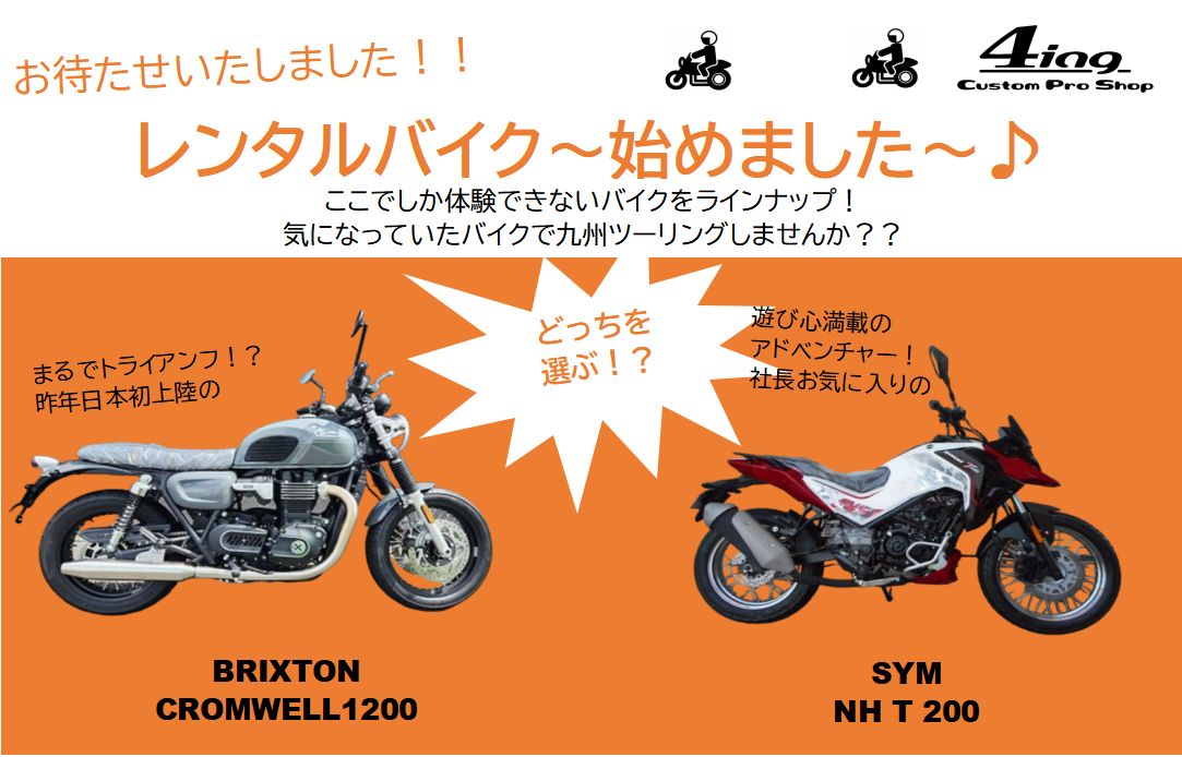 レンタルバイクできます!! なかなかレンタルで乗ることができないBRIXTON CROMWELL1200とSYM NH T 200をラインナップ!海外メーカーは乗り味が気になるところですが、購入検討の試し乗りとしてもオススメです!販売も行っておりますのでお気軽に店舗スタッフまでお声掛けください!!※ヘルメット、グローブ等、装備品はご持参ください。